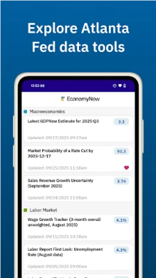 Aplikace EconomyNow od Atlanta Fed přináší aktuální ekonomická data. Prozkoumejte populární nástroje jako GDPNow a Wage Growth Tracker, sledujte trh práce, inflaci a hospodářský růst. Nabízí interaktivní grafy a nejnovější přehledy pro ekonomy, studenty a zájemce o ekonomiku.
