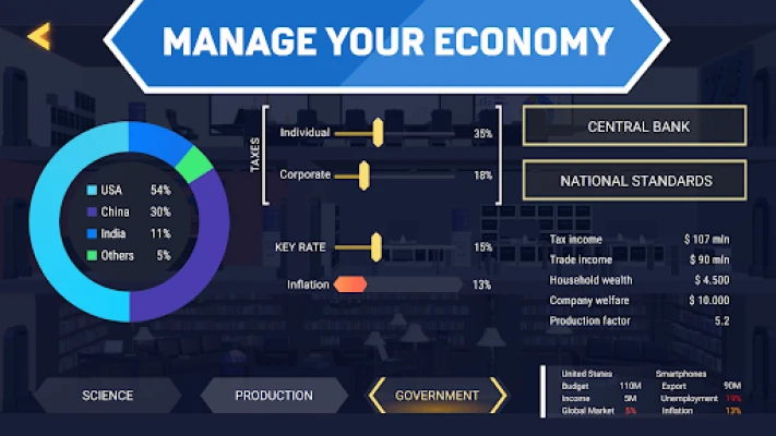 V Trade Wars máte na dosah šest klíčových odvětví, která čekají na vaši inovativní ruku, abyste z nich vytvořili globální lídry. Monitorujte kritické ekonomické ukazatele, jako je inflace a nezaměstnanost, a obratně spravujte státní pokladnu vybíráním daní a vytvářením strategických rezerv. Posilujte svou vnitřní ekonomiku podporou domácí výroby a neustálým vylepšováním kvality zboží při současném snižování výrobních nákladů. Zapojte se do prozíravé diplomacie, uzavírejte klíčové dohody s jinými národy nebo naopak využijte sílu sankcí k prosazení svých zájmů.